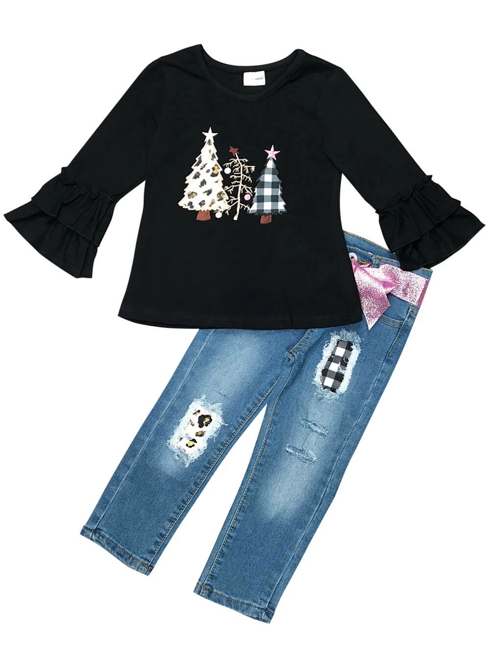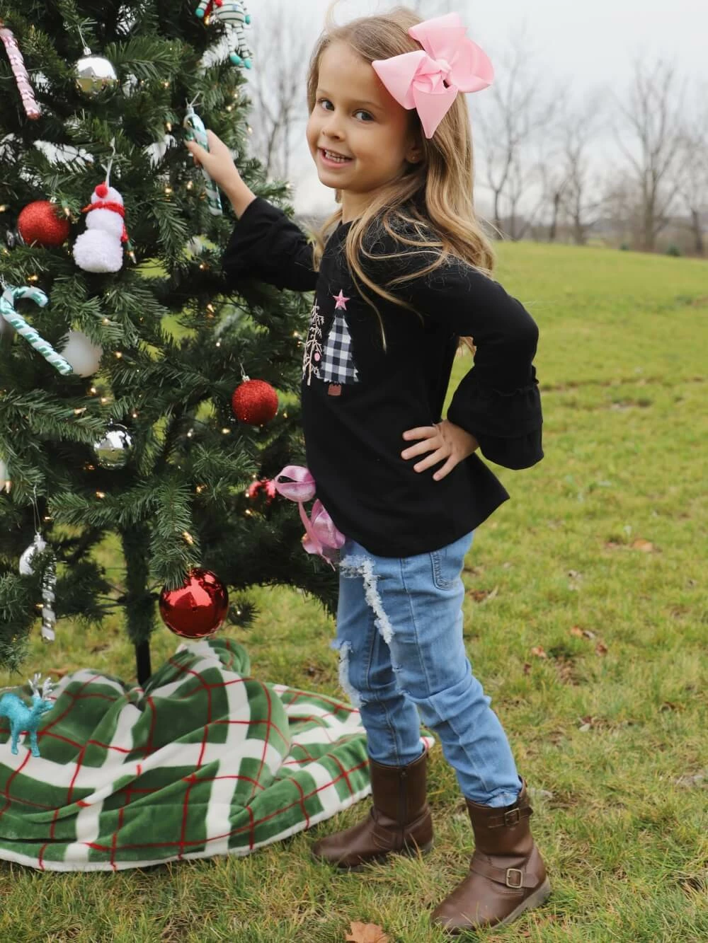 Get your sparkle on Santa babes! Our Sparkle in Pink Tree Distressed Denim Outfit will fulfill your diva’s glitter filled dreams. This fashionable set includes a black long sleeve top with a multi-patterned tree detail, denim jeans with black and white plaid patch and a leopard print patch, and a light pink satin tie belt! We are just loving the combinations of prints and patterns, it adds a girly touch on your average holiday outfit. She can pair this outfit with booties, sneakers, flats, and so much more! Your little one can wear this set to school, play dates, brunch dates, and so much more! This best seller will not stay in stock for long so add it to your cart now!