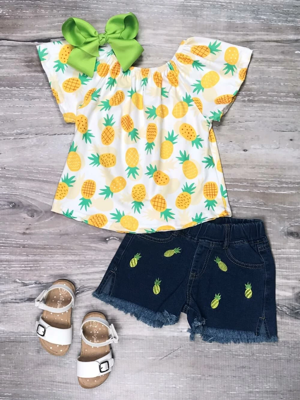Stand tall and show off her true sweet style with our Stand Tall Like A Pineapple Denim Girls Shorts Outfit. The sassy set comes with a pineapple patterned short sleeve top that features a cold shoulder cut that can be worn on or off the shoulders. The set also comes with a pair of elastic waist denim shorts that include embroidered pineapple details and distressed detailing on the bottom. We are loving the fruity outfit with some simple sandals and a cute yellow hair bow. Your little diva can wear the outfit on vacations, parties, picnics, running errands, and so much more! Buy now, babes!