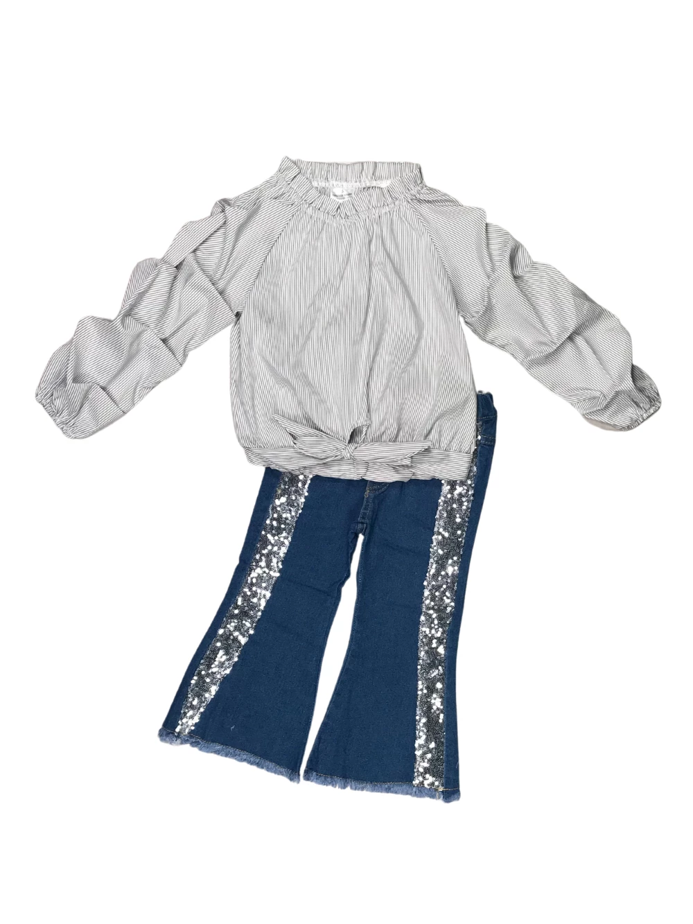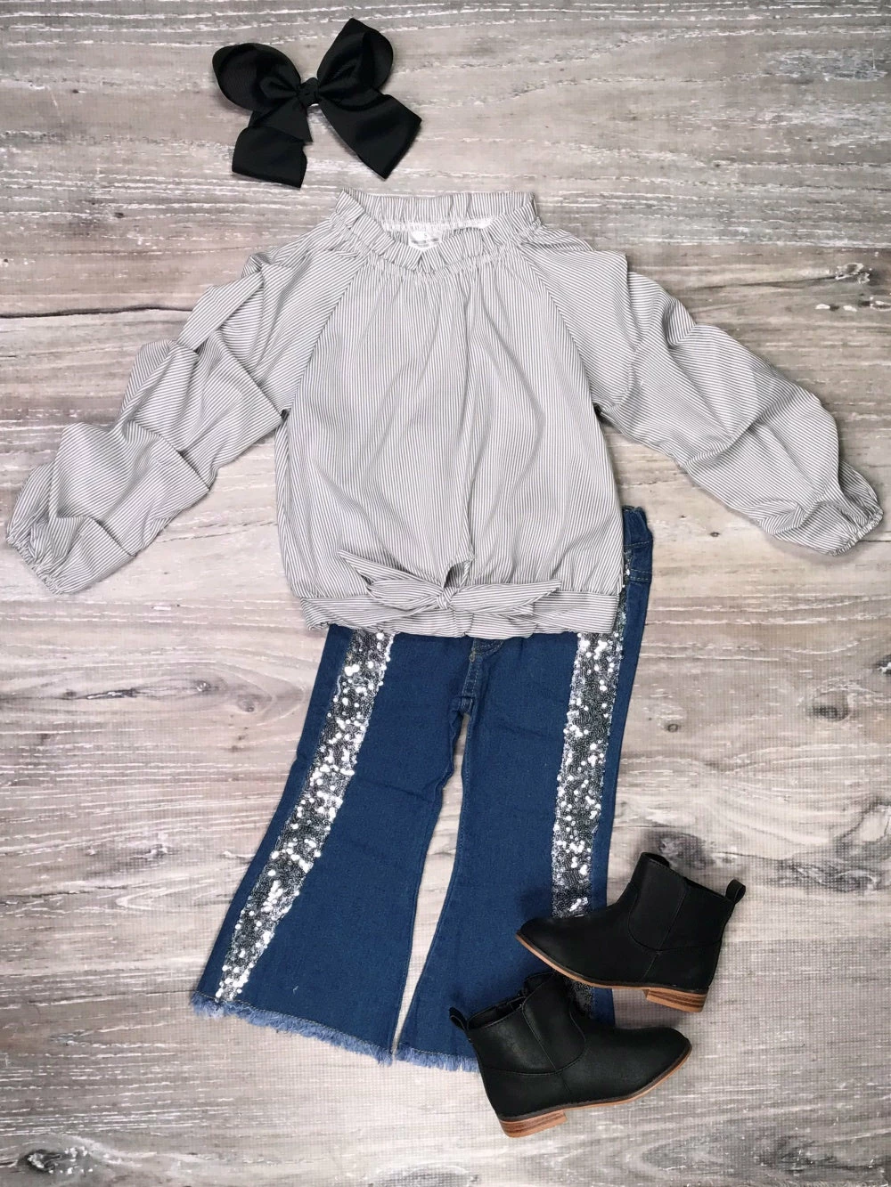 Shine bright with our Super Silver Stripe Ruffle Tie Knot Sequin Denim Flare Girls Outfit! The super cute set comes with a gray long sleeve top that features ruffle trim, scrunched detailing, and a tie knot along the bottom. The set also comes with a pair of flare denim jeans that feature silver sequins along the sides. We are loving this glitzy set with some booties or sneakers and a coordinating hair bow. The set is perfect for school, parties, playdates, running errands, and so much more. Pick up this set while her size is still in stock and be sure to checkout our other best selling denim outfits.