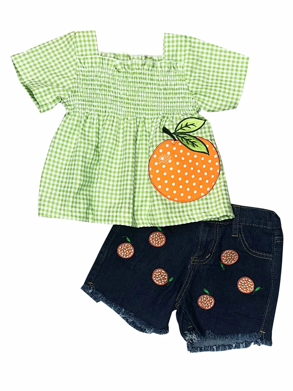 Orange you glad we released another gingham outfit! Our Sweet Orange Gingham Green Denim Girls Shorts Outfit will continue your obsession in the most fashionable way! The sweet and stylish outfit comes with a green gingham short sleeve smocked style top that features an orange detail on the bottom. The set also comes with a pair of coordinating dark wash denim shorts that include embroidered orange details. We are loving this outfit with some sandals and a large orange hair bow. The outfit is perfect for picnics, trips to the farmers market, vacations, breakfast dates, and so much more! Buy now!
