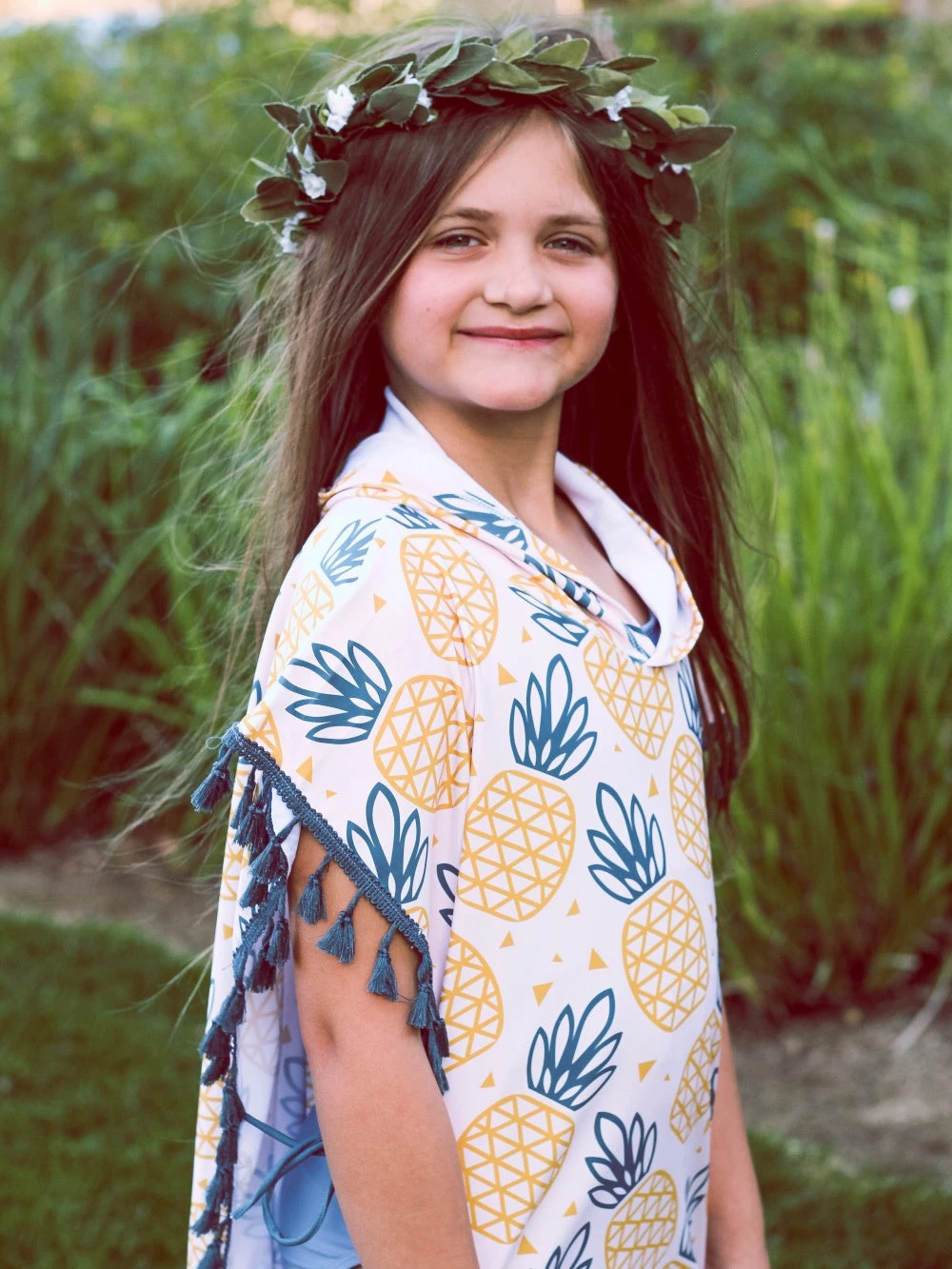 Sweeten up her summer with our fashion forward Sweet Yellow Pineapple Fringe Girls Hooded Swim Coverup! The coverup features a yellow pineapple pattern, a hood, navy blue fringe trim, and navy blue pockets. Isn’t the pineapple pattern just so cute and perfect for the summer!? We are loving this coverup for vacations, beach days, pool parties, swim lessons, and so much more. Just throw this coverup over her fav bikini and pair it with some sunnies and sandals and she’ll be ready to take on her fun filled day. Pick up this essential coverup and be sure to checkout our other must have swim pieces and essentials.Â