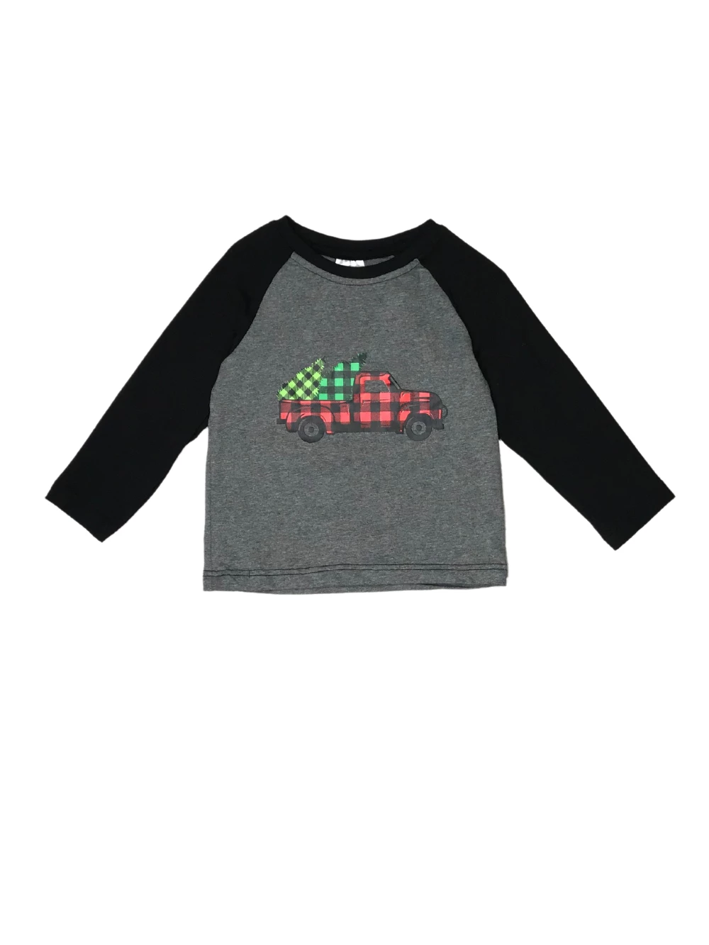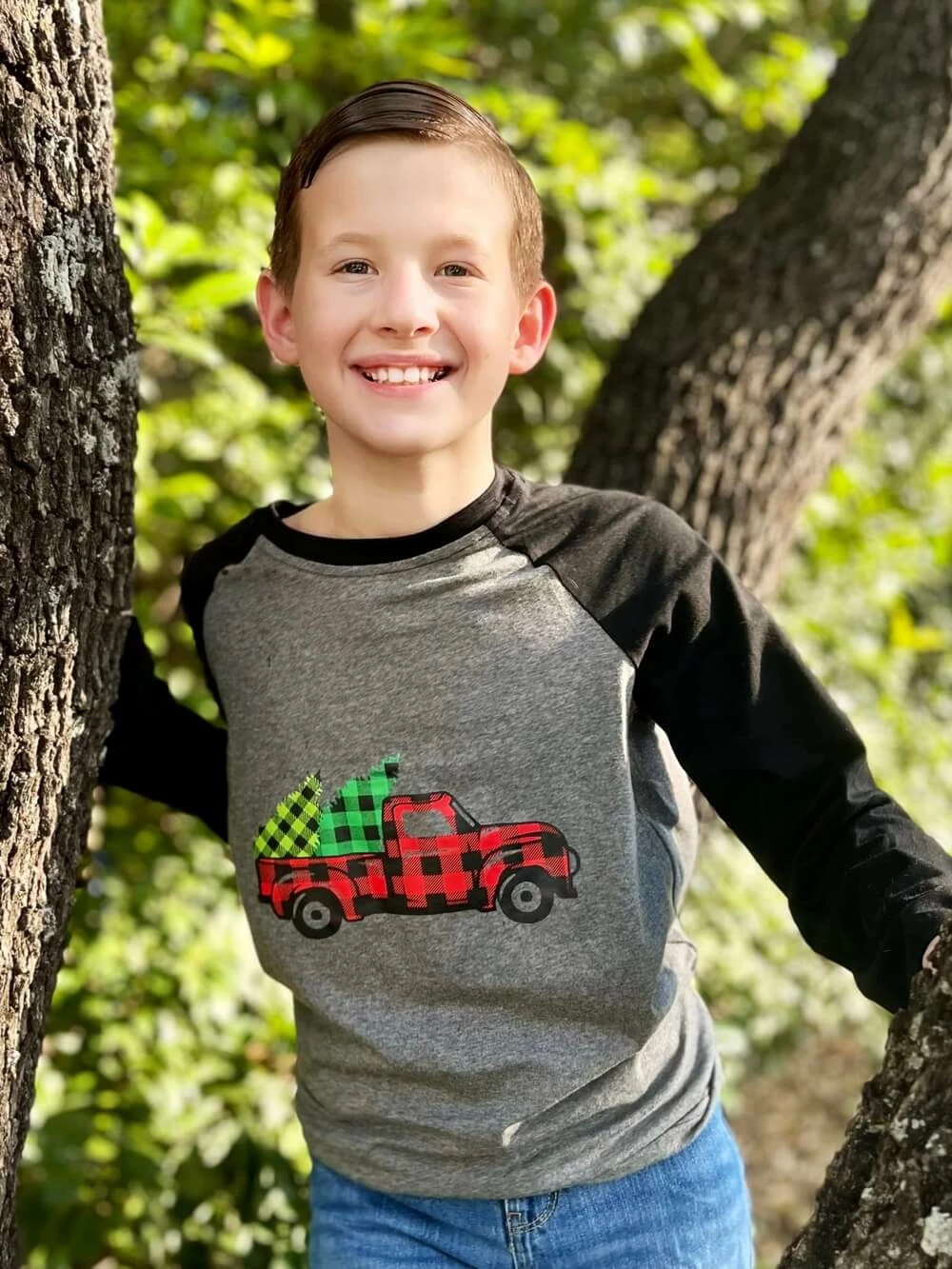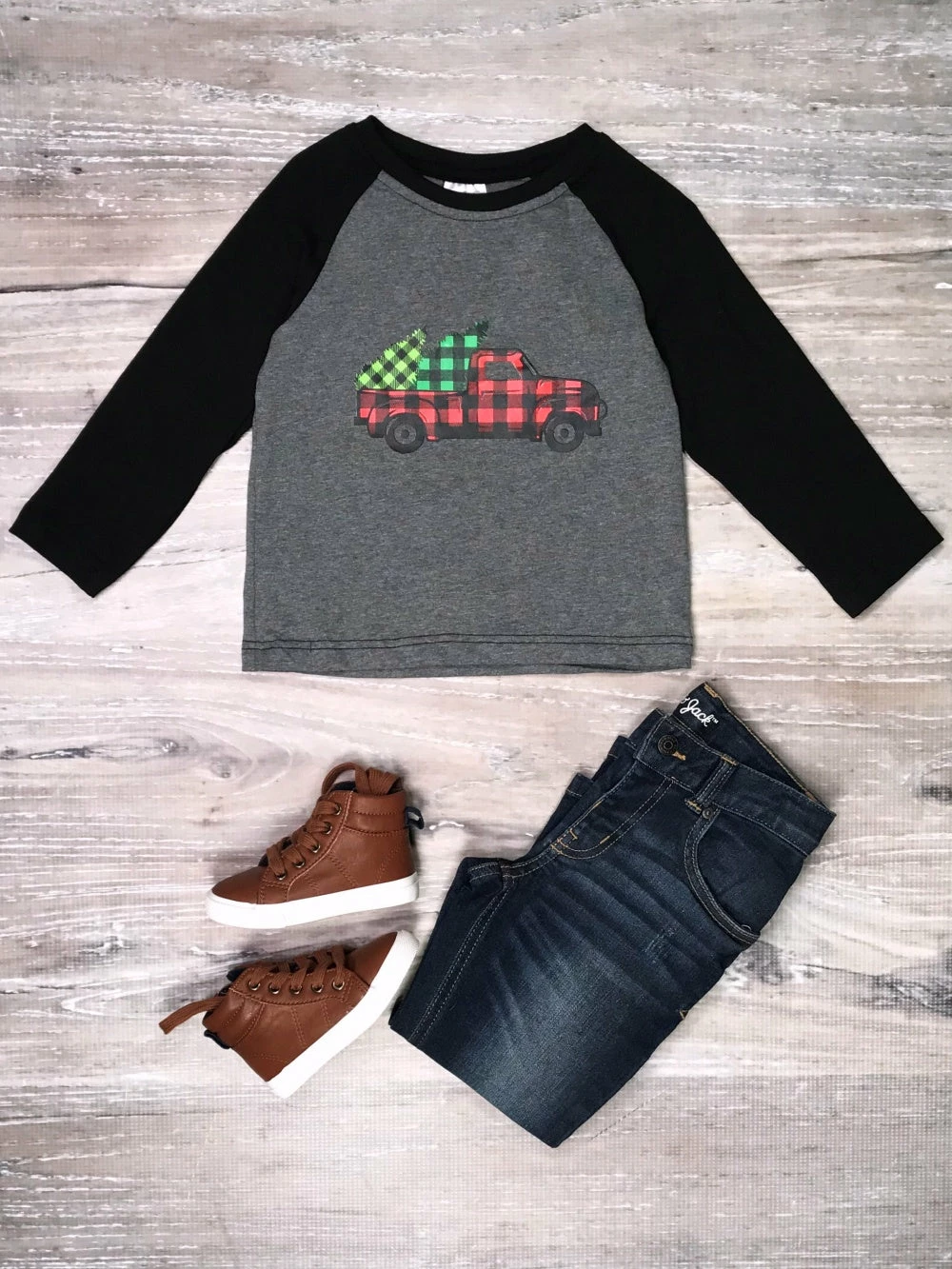 Style your little one this holiday season with our simple yet classic Christmas Tree Farm Truck Plaid Raglan T-Shirt! The must have gray long sleeve raglan shirt features black sleeves as well as a plaid patterned truck detail. We are loving this simple t-shirt with some denim jeans, joggers, leggings, or whatever your little is in the mood to pair it with. The shirt is perfect for picking out a Christmas tree, school, running errands, holiday parties, and so much more! Pick up this shirt while it’s still in stock and be sure to checkout our other best selling holiday styles.Â