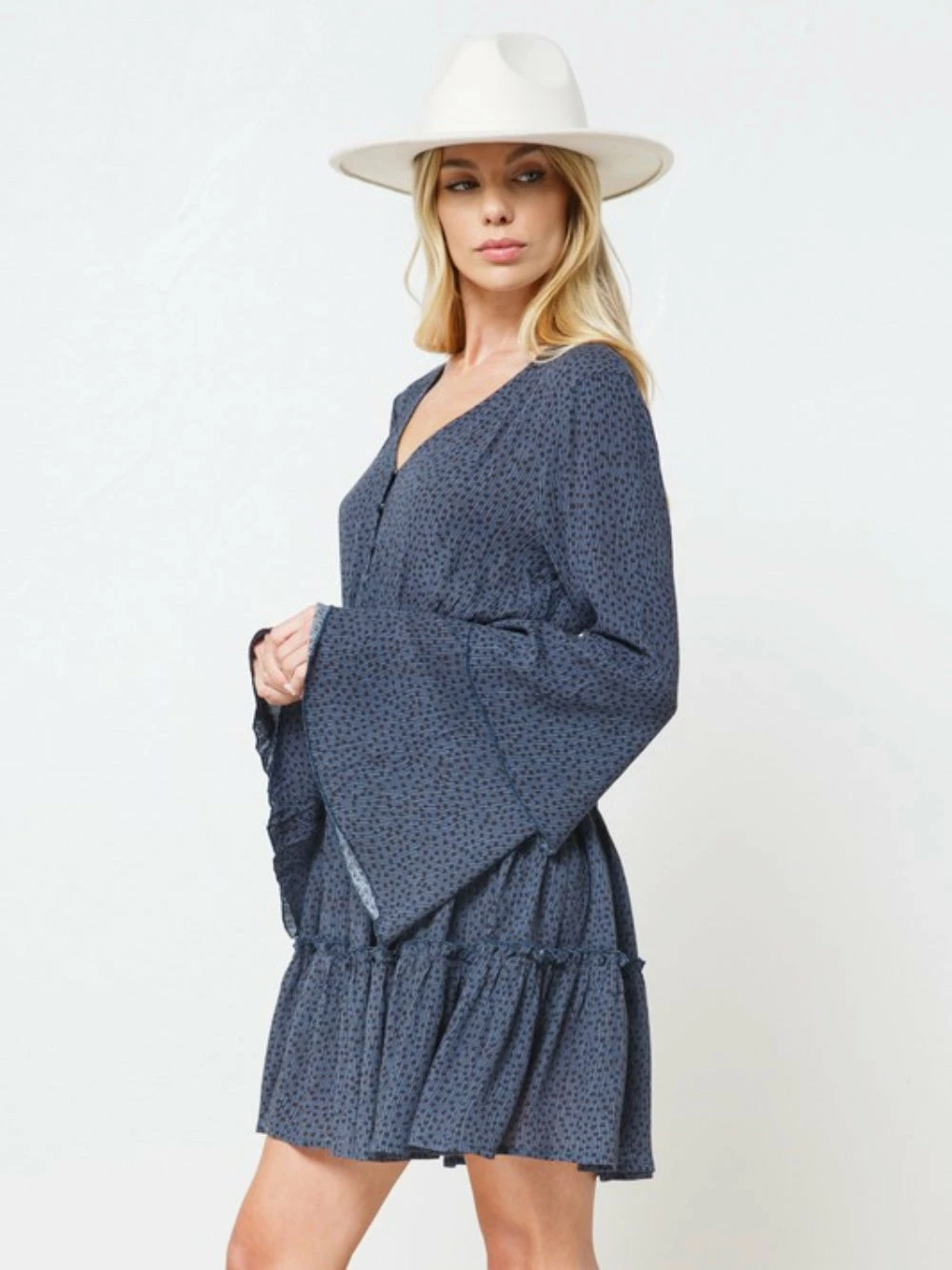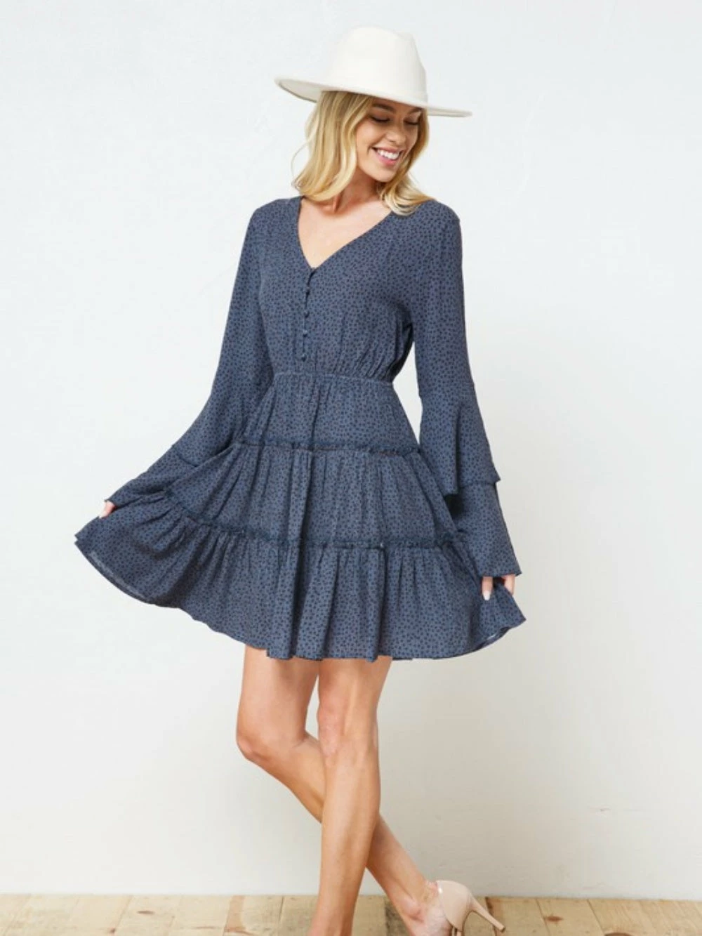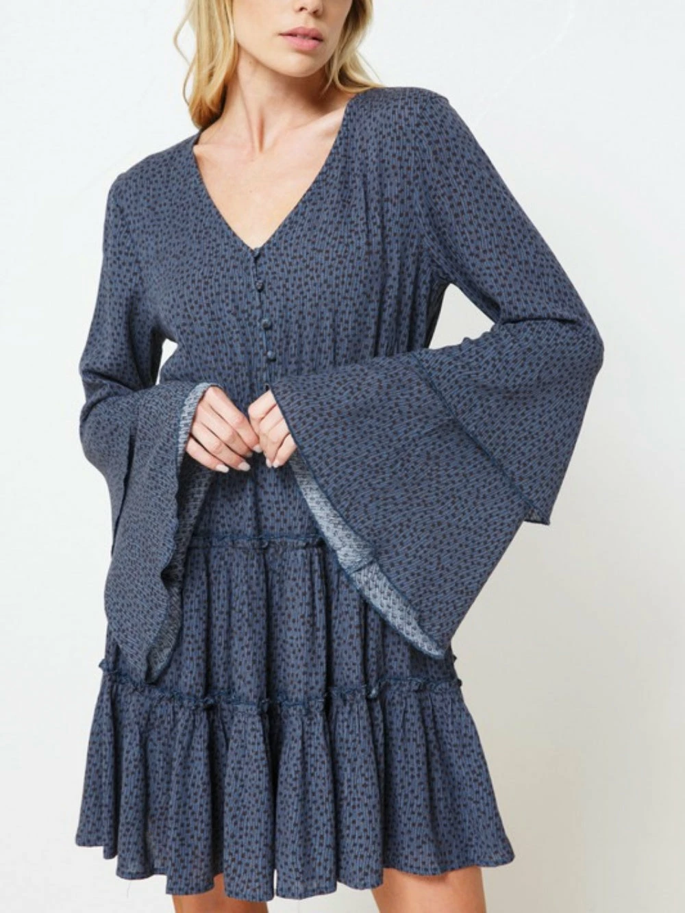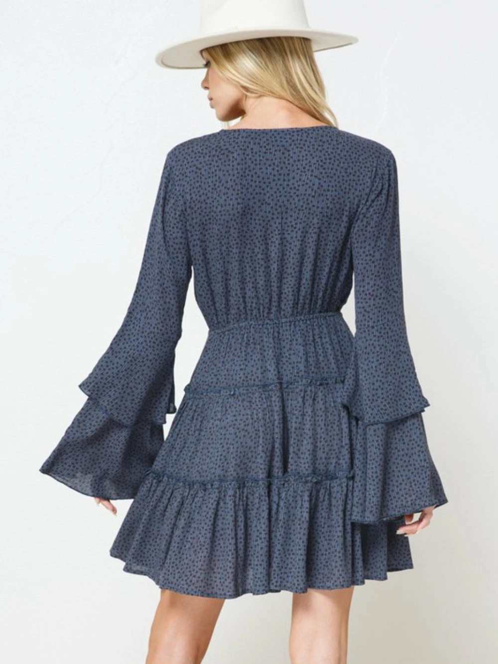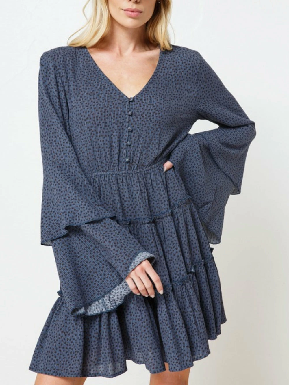 Our Titan Blue Polka Dot Button Up Tiered Bell Sleeve Women’s Dress is a total must have this holiday season. The blue and black speckled polka dot dress features a button up detail, a tiered silhouette, and the most gorgeous bell sleeves! We are obsessed with this color for fall, winter, or spring. Can you imagine this beauty for holiday photos? Whether you wear to work, date night, or the holidays, you’ll be chosen best dressed by far! You know it’s time to buy a little something for yourself!