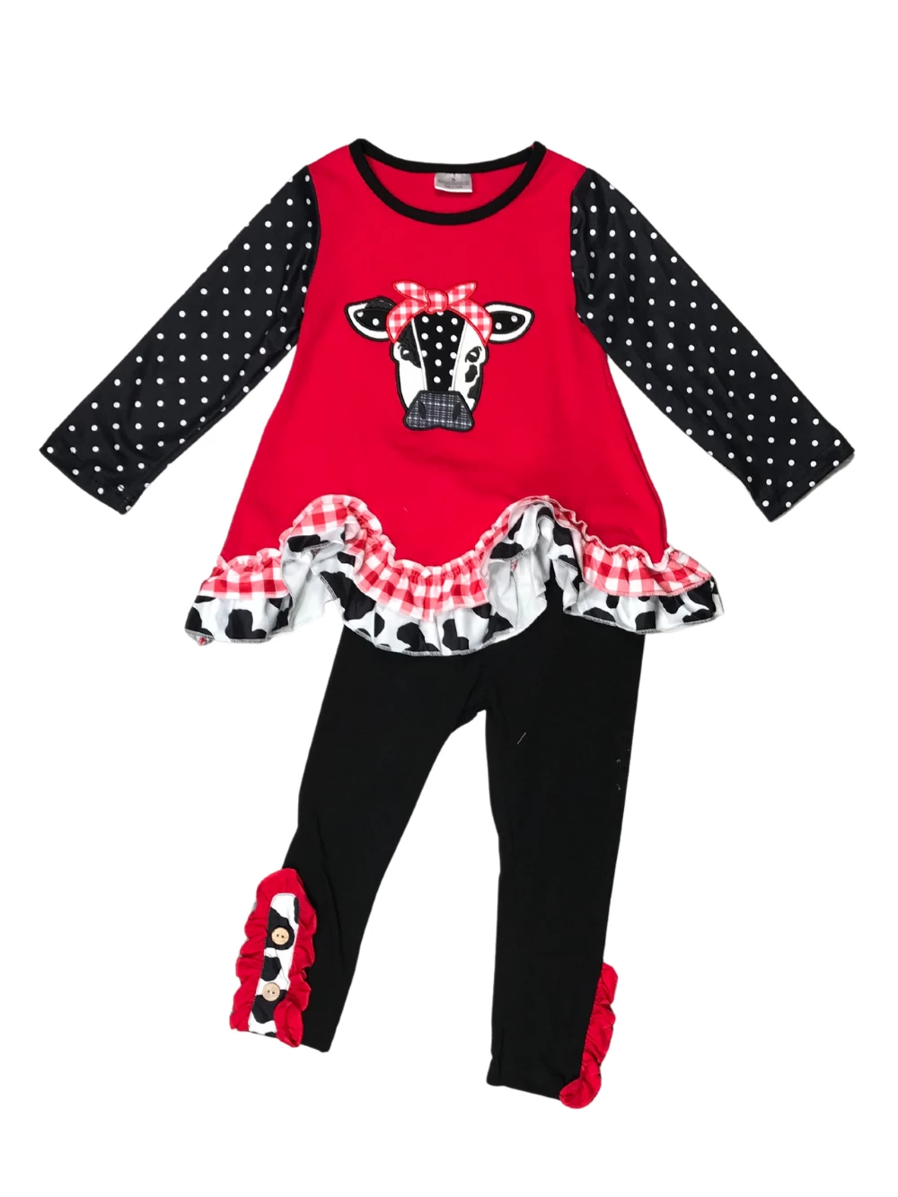 Look fabulous and fashionable in our Udderly Fabulous Cow Polka Dot Ruffle Red Girls Outfit! The stylish set comes with a long sleeve top that features a polka dot pattern along the sleeves, a cow detail, and patterned ruffle trim along the bottom. The set also comes with a classic pair of coordinating leggings that feature red and cow patterned ruffle trim along the sides. We are loving this lovely set with some booties or sneakers and a coordinating red hair bow. The outfit is perfect for trips to the farm, school, running errands, playdates, and more. Add this outfit to her collection and be sure to checkout our other best selling sets.