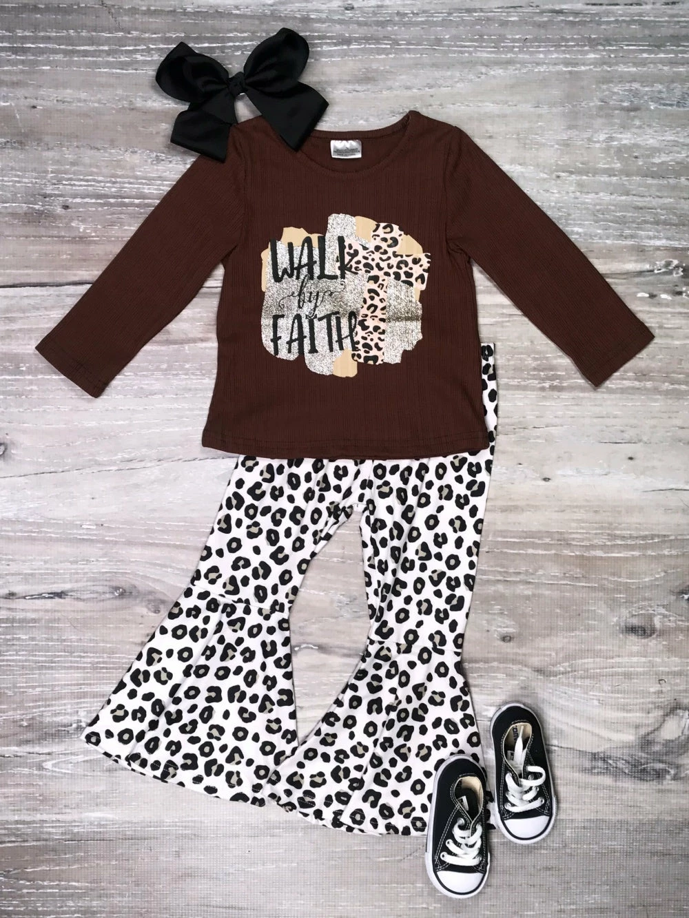 Keep the faith strong in her life with our Walk By Faith Cross Leopard Brown Bell Bottom Girls Outfit! The set comes with a brown long sleeve top that features the phrase “Walk By Faith” and a coordinating leopard patterned cross detail. The set also comes with a pair of coordinating brown leopard patterned bell bottom pants. We are loving this outfit with some booties or sneakers and a coordinating brown hair bow. The outfit is perfect for school, running errands, church festivities, parties, and so much more. Pick up this outfit while her size is still in stock and be sure to checkout our other must have outfits.