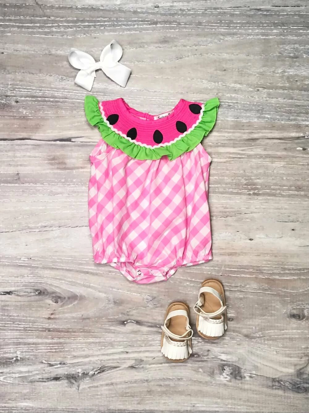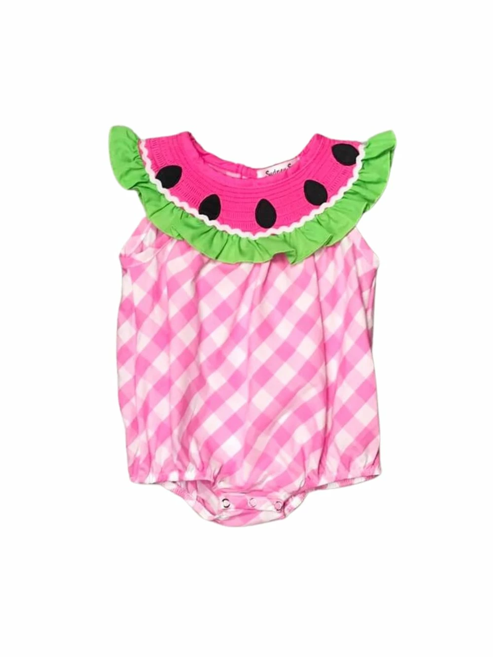 Your little one will be as sweet as watermelon in our Watermelon Daydream Pink Gingham Smocked Collar Baby Girl Romper! This absolutely darling romper features a pink gingham pattern, a smocked collar in the design of a watermelon, green ruffle detailing, and snaps. We are loving the snaps feature as it makes for quick and easy diaper changes. This romper is perfect for parties, vacations, running errands, and so much more. Just pair this romper with some white sandals and a pink hair bow and she’ll be looking sweet. Pick up this romper for your little cutie and be sure to checkout our other must have baby rompers and outfits.