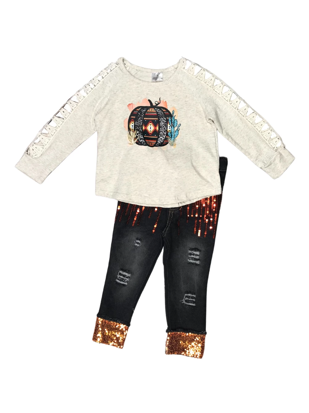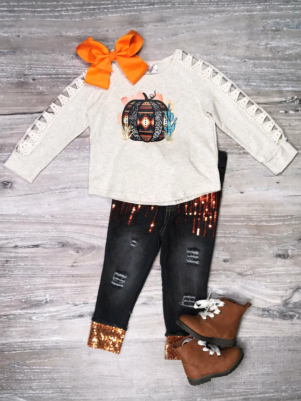 Take her pumpkin obsession out west with our Western Serape Cactus Pumpkin Lace Sequin Denim Girls Fall Outfit! The super sassy set comes with a cream long sleeve shirt that features lace cutout detailing along the sleeves and a patterned pumpkin detail. The set also comes with a pair of denim jeans that feature distressed detailing and orange sequins. We are loving this outfit with some brown booties and a large orange hair bow. The denim outfit is perfect for trips to the pumpkin patch, running errands, parties, playdates, and so much more! Pick up this outfit while it’s still in stock and checkout our other pumpkin themed favorites.