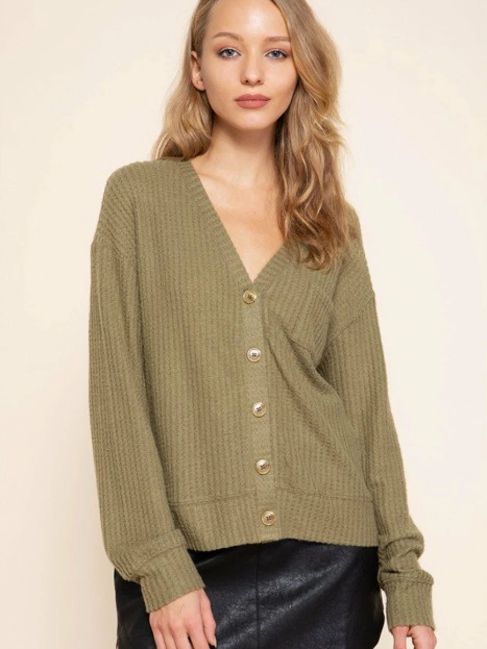 You’ll have to fight Jen for our Olive Button Up Brushed Waffle Knit Women’s Cardigan! The trendy olive cardigan has a loose fit, wooden button front, and an amazingly soft waffle knit fabric. We are loving this cardigan buttoned up as a v-neck top or leave it open with an SSS bodysuit or graphic tee. The cardigan is perfect for fall or winter photos, running errands, lounging, and so much more! Treat yourself and pickup this sweater while it’s still in stock! Trust us, it won’t last long.