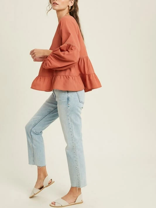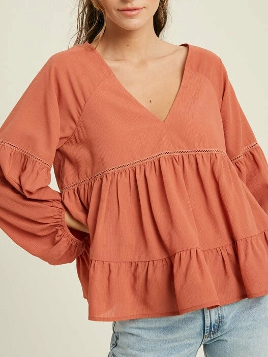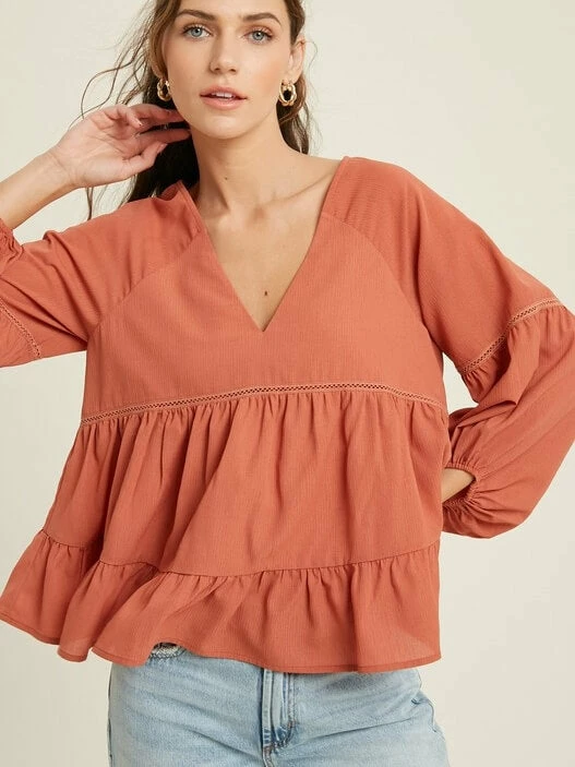 Update your wardrobe with our trendy and classic Women’s V-Neck Woven Lace Trim Baby Doll Blouse Ginger! The orange long sleeve babydoll style blouse features a v-neck cut, lace trim, and tiered ruffles. We are loving this blouse with denim jeans, leggings, or a cute skirt. The blouse is perfect for work, dinner dates, shopping trips, and so much more! Wear the blouse by itself or throw on a cozy sweater for a more relaxed style. Pick up this blouse for your fashion forward collection and checkout our other stylish picks.