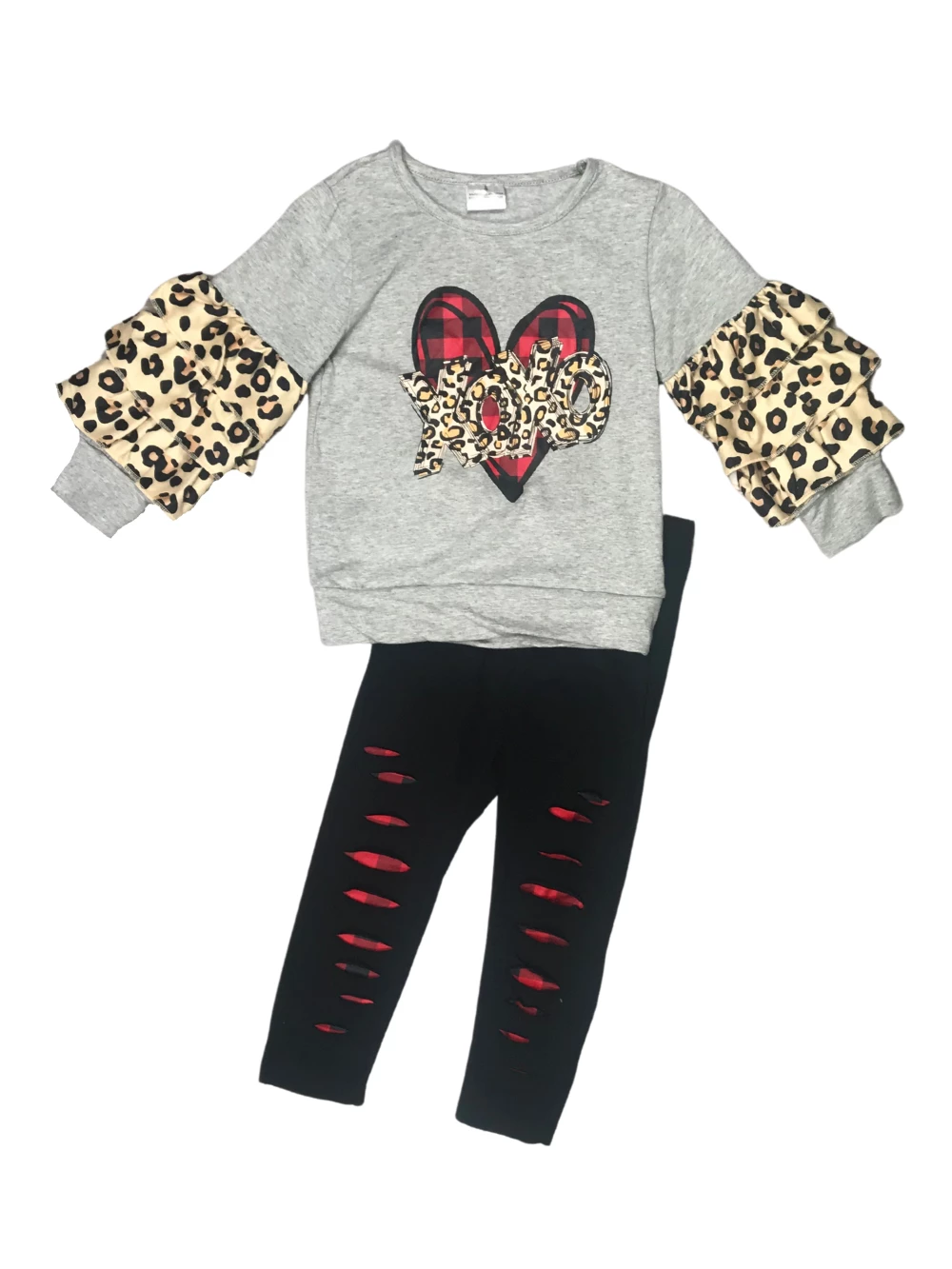 Dress the part this Valentine’s Day season with our XOXO Cheetah Girl Buffalo Plaid Ruffle Girls Valentine’s Day Outfit! The stylish set comes with a gray long sleeve top that features a plaid patterned heart detail, the word “XOXO,” and cheetah patterned ruffle details along the sleeves. The set also comes with a pair of black leggings that feature distressed detailing and buffalo plaid patterned patches. We are loving this outfit with some booties or sneakers and a coordinating hair bow. The leggings set is perfect for school, parties, playdates, running errands, and so much more. Pick up this set while you still can and be sure to checkout our other seasonal styles.